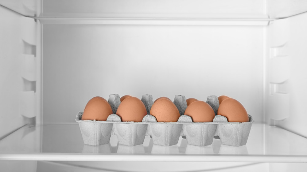 Even more important, when refrigerated eggs are left at room temperature, they will last less than two hours (per the USDA), so the FDA recommends buying only refrigerated eggs and not wasting any time before putting them in your fridge at home. Another tip: Keeping the carton on the middle shelf at the back of the refrigerator is better than that dedicated slot in the door. This is because the middle shelf has a more consistently cool temperature compared to the door, which is opened and closed very often (via Good Housekeeping).