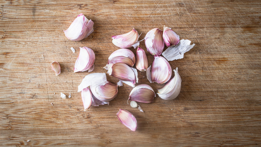 Smash the garlic bulb (or bulbs, if using two), and separate it into unpeeled cloves. Distribute the unpeeled garlic in between the potatoes — the cloves will caramelize as the potatoes cook, giving the whole tray an amazing smell and taste. The garlic bulbs themselves become jammy and caramelized once roasted, so if you're a fan of that sweet, heady taste, you may want to use two whole heads of garlic. If you're just looking for a faint aroma, one bulb is enough.