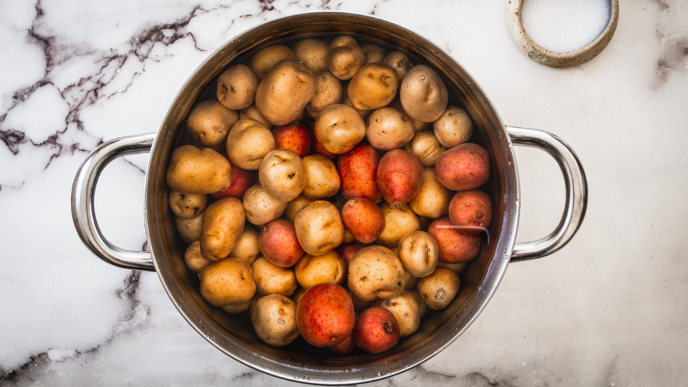 - Add the potatoes to a large pot with salted water. Bring potatoes to a boil and cook for about 15 minutes, allowing the insides to cook fully (which will keep them fluffy as we roast).