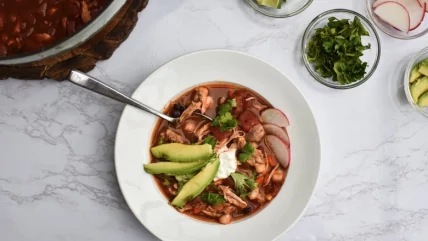 This recipe calls for a lot of ingredients, but don't worry, because it really is easy to prepare once the chopping and measuring is done. You'll need carrots, fresh jalapeño, canola or vegetable oil, chopped onion (fresh or frozen), cumin, ancho powder (you can substitute a chili powder blend, or cayenne if you want it extra spicy), ground cinnamon, kosher salt, red enchilada sauce (mild, medium, or hot), low-sodium chicken broth, canned chopped tomatoes, black beans, vegetable or chicken bouillon paste (or cubed bouillon), garlic powder, boneless skinless chicken thighs, canned hominy, frozen corn, red wine vinegar, and honey. In addition, gather some items for garnishing, with the ideal choices being cilantro, radish, sour cream, avocado, and/or lime.