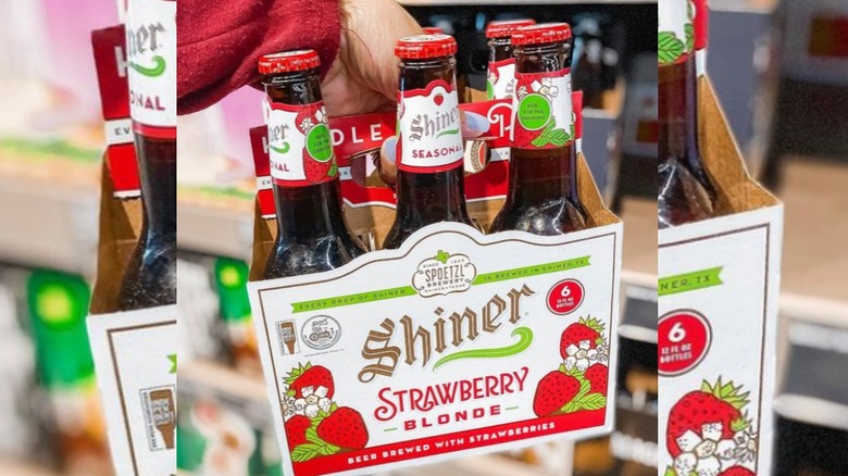 According to Shiner, the Strawberry Blonde is a seasonal beer with a 4.3% ABV and is made with strawberries from Poteet, Texas, referred to as the Strawberry Capital of Texas. Mashing In shared that the Shiner Strawberry Blonde was a seasonal offering back in 2017. The beer has been described as "quenching," with the flavor of "juicy homegrown strawberries" and a "crisp finish." Given that it's both a seasonal release and an Aldi find, if you want to take a sip, it might be best to grab a six-pack before Shiner Strawberry Blonde disappears from the shelf.