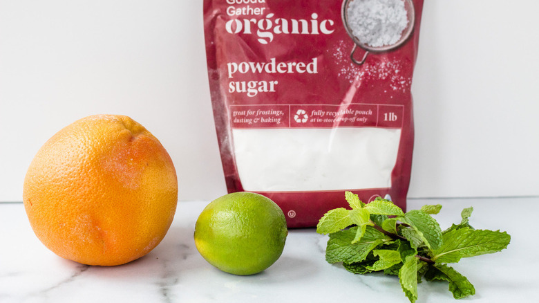 When the cake is nearly cooled, assemble the ingredients to make that glorious glaze. To make it, you'll need 1 tablespoon of lime juice and 2 tablespoons of grapefruit juice, along with 1 cup of powdered sugar (aka confectionary sugar). You may also want to grab some fresh mint to garnish.