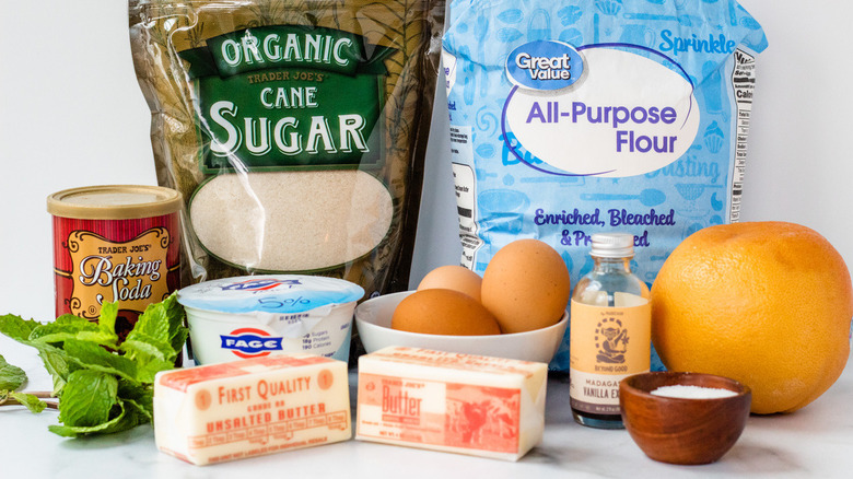 In addition to the grapefruit, you'll need the usual pound cake suspects: sugar, flour, baking soda, salt, and vanilla. You'll also need butter, eggs, and Greek yogurt, all of which should be at room temperature before beginning. This will help all of these ingredients combine into the batter more evenly.