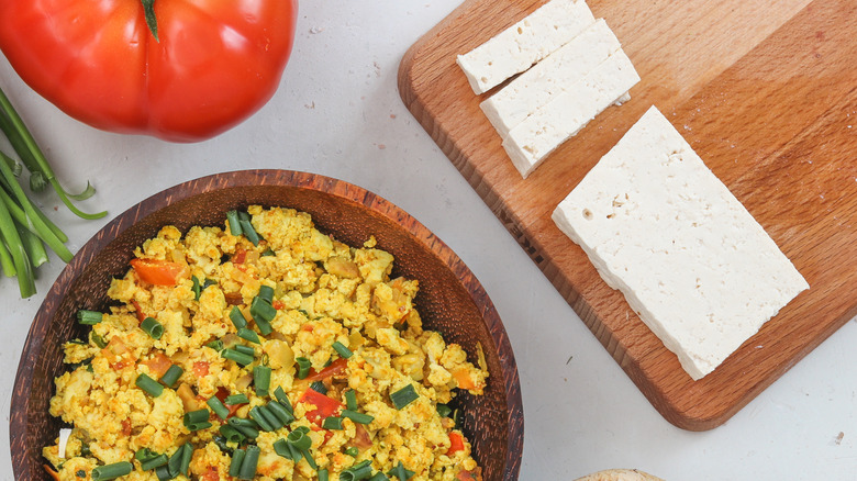 Unlike regular tofu, the kind most commonly used as a meat substitute in the plant-based food community, silken tofu has a smooth, custard-like texture (via The Kitchn). This is fundamentally why The Spruce Eats says it's a perfect substitute for eggs. Though you'd probably never initially think to whisk or beat a block of silken tofu, its liquid and solid properties make it as versatile as eggs. As The Spruce Eats explains, it can even go through the blender. If dietary restrictions are preventing you from eating eggs, or you just don't have anymore left in your fridge and want to make breakfast, silken tofu can come in handy for practically any recipe that calls for them, even your favorite desserts. In terms of texture, flavor, and protein content, silken tofu comes pretty close to the real thing.
