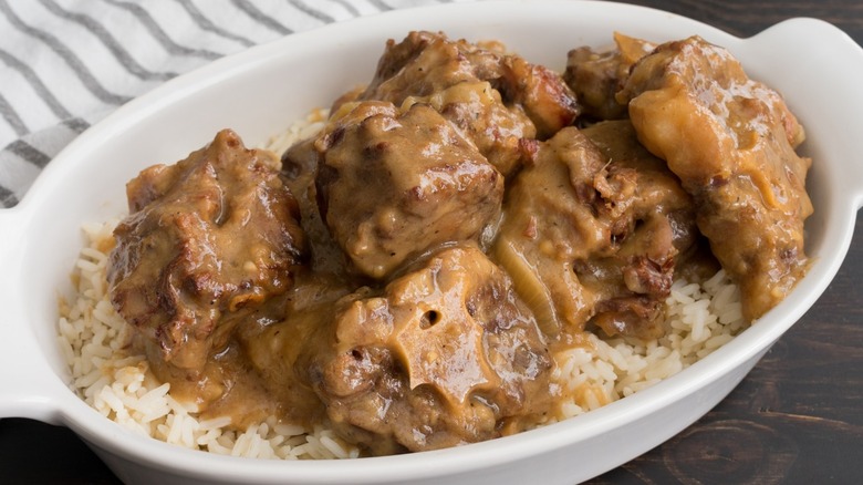 Meanwhile, Romans like to make coda alla vaccinara — a braised oxtail dish with tomatoes, celery, and warming spices — while Eastern Europeans enjoy the cut in barley soup with a side of rye bread. Of course, The Spruce Eats points out that since oxtails are mostly bones with a little bit of meat, people like to use the bones and marrow to make beef stock as a base for soups and stews. As you've probably deduced, oxtail needs to be cooked slowly so the tough meat can break down into a melt-in-your-mouth texture.