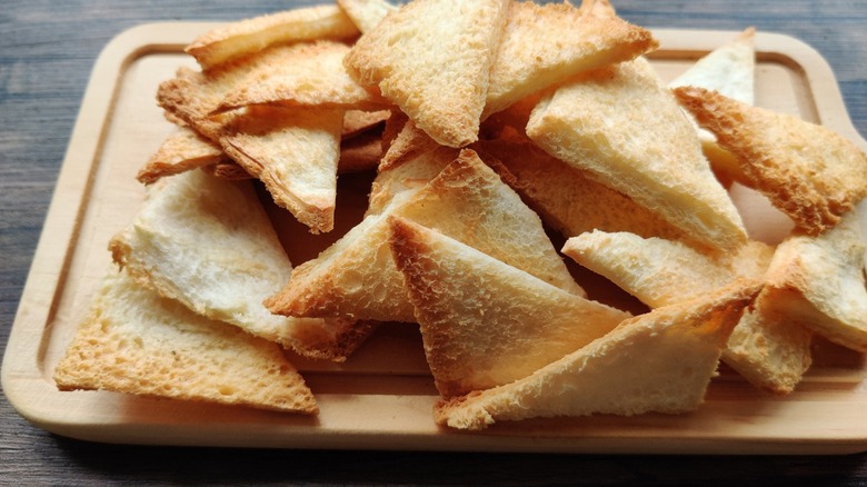 For starters, if the loaf of bread you have to work with is an unsliced one, you'll need to slice it. Even if your loaf is the greatest thing since sliced bread (because it is sliced bread), Leung suggests carefully slicing the bread through the middle again as this will give you "a thinner toast," but does add that this extra step is optional. You'll also need to remove the crusts from the sliced bread. If you find this step a bit of a pain in the rear, think of it as payback for all the times you made your mom cut those icky crusts off your childhood PB&Js. Lay the sliced bread on a baking sheet (no need to grease or line the pan), then bake it at 300 F until it's golden brown. In this case, it's no big deal if you forgot to preheat the oven, since there's no precise timing involved, but Leung said it took his toast about 25 minutes to reach the desired state of doneness.