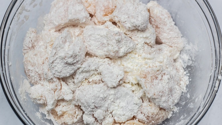 - Coat the cubed chicken with the first ¼ cup portion of cornstarch, either in a bowl or in a plastic storage bag.