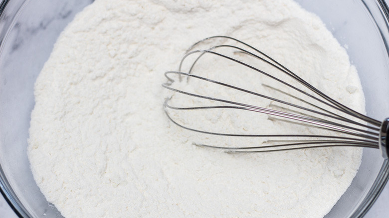 Choose a large mixing bowl and whisk together the all-purpose flour, white sugar, baking powder, the zest from 1 lemon, and salt. Pre-mixing the dry ingredients helps to incorporate the small quantities of baking powder and salt throughout the flour so they're evenly distributed. This is essential for the dough to rise properly. Also, if your flour has any lumps, this will help smooth it out.