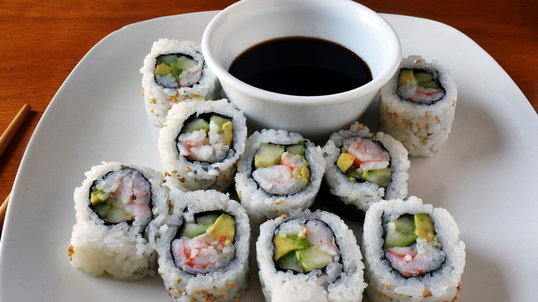 The fact that the California roll is served uramaki (inside-out) puts all that sticky, seasoned rice on the outside, just crying out to be covered with ... something. California rolls are often served with a sprinkle of sesame seeds over the exposed rice (via Shogun Japanese Steakhouse). Others are rolled in fish roe, often flying-fish eggs or tobiko (via NDTV Food), giving the senses yet another color and flavor to savor. Another variation is to set raw fish or a slice of avocado over a California roll, creating a rainbow roll (via International Cuisine).