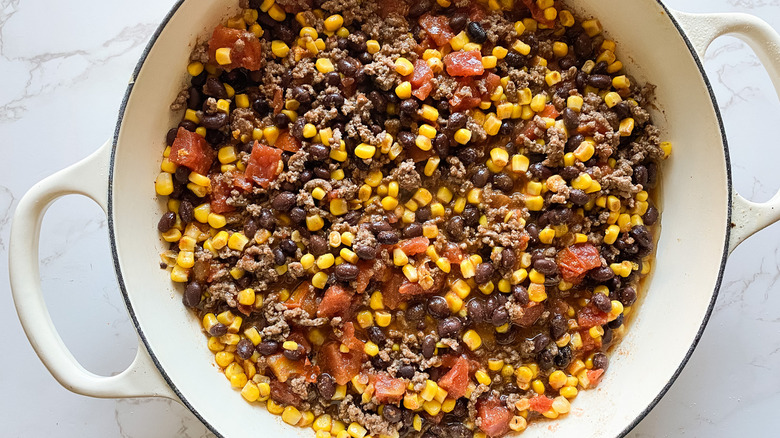 Into the same skillet as your browned meat, add the drained beans and corn, diced tomatoes with their juices, dried cumin, chili powder, and onion powder. Stir everything around well until it's thoroughly combined, as you don't want to have clumps of dried spices in your finished dish. At this point, it's just a matter of heating everything through and allowing the flavors to combine. Five minutes on the stovetop should do it.