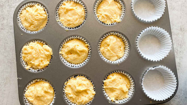 - Scoop the batter into the prepared muffin tin evenly. Bake for 15 minutes.