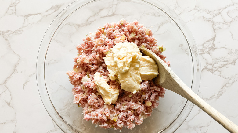 You can chop the ingredients during your prep or save some time by purchasing already-cut onions and celery (just be sure they're fresh — you'll want some crunch in your ham salad). When chopping the celery, remember to save the leafy end section — these leaves add a nice flavor to soups and broths and are also tasty when mixed into a salad.