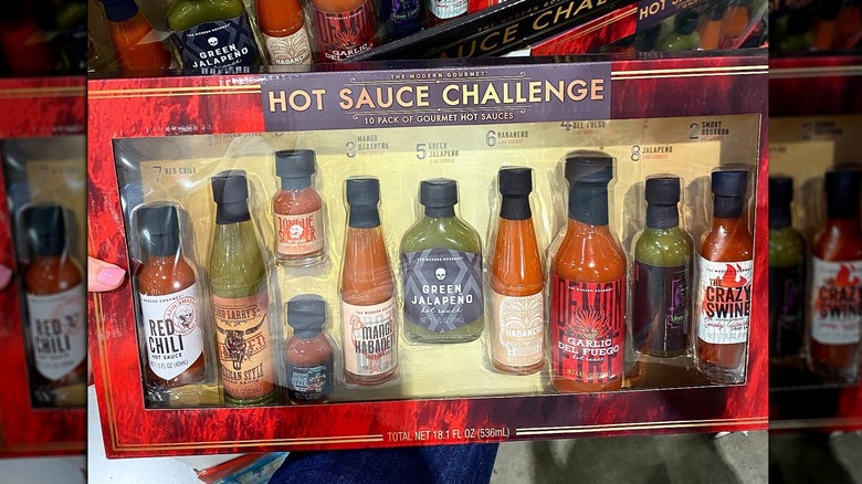 Costco's new Hot Sauce Challenge contains flavors of hot sauce from the brand The Modern Gourmet, per Yahoo. The flavors span from the mild-sounding Smoky Bourbon and plain ol' Jalapeño to varieties that are aimed at true chili heads, with intimidating names such as Tongue Scraper Extreme Red and Brain Killer — yikes! Presumably in the middle of such extremes lie flavors including Red Chili and Mexican-Style.