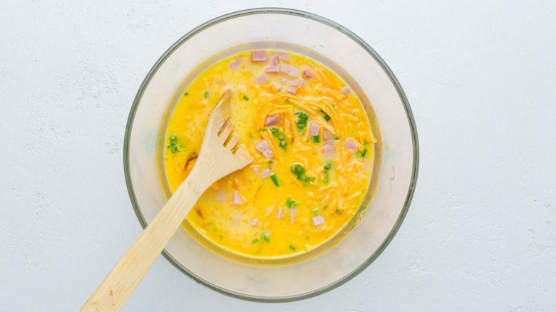 This dish only requires a few ingredients, and you may have most of them at home already. You will need to round up six eggs, 1 cup of milk, and ham. You'll also need shredded cheddar cheese, green onions, and Dijon mustard. Last but not least, salt, pepper, and non-stick cooking spray complete the list of essentials for this recipe. If you're a vegetarian, Leo shares that "you can use any plant-based protein or substitute the ham for veggies." Once you have everything together, it's time to begin preparing.