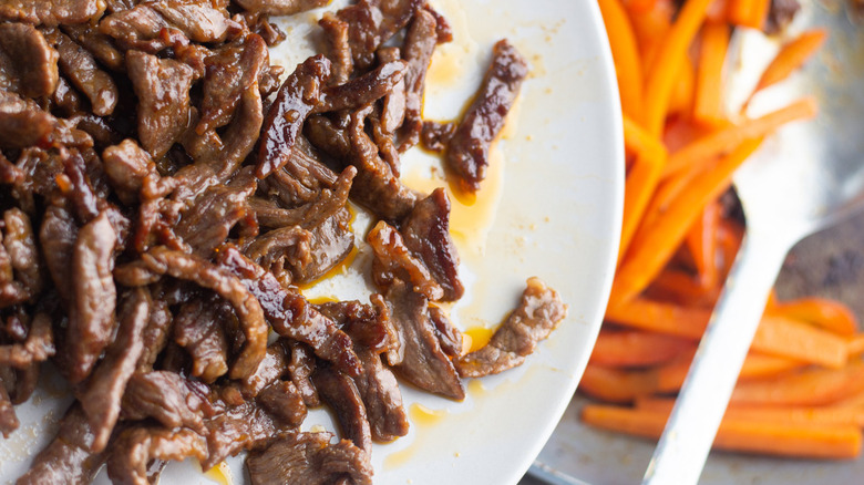 - Cook the marinated steak in 1 tablespoon of chili oil (in batches, if need be) for 3 to 4 minutes, stirring constantly.