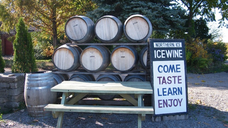 Ice wine, or eiswein as it is called in Germany and Austria, is a special type of dessert wine that's made from grapes harvested late in the winter in cold climates after they have frozen on the vine, according to Wine Folly. As The New York Times reported, in Canada, a product can't be called ice wine at all unless the grapes were picked at a temperature of 17.6 F or lower, and US producers generally follow Canadian standards.