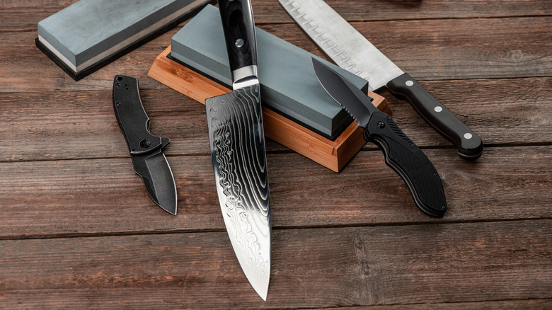 A whetstone is an essential piece of cooking equipment that you'll want to acquire immediately if you don't have one yet. As explained by Cook's Illustrated, a whetstone is simply a stone block that acts as a sharpening tool for knives. These days, most commercial whetstones are synthetic, and typically feature two sides: one with a coarse grit, and the other with a fine grit. To appropriately sharpen a knife — more on the exact technique later — you pull the blade across the surface of the coarse side first, then use the fine side to more delicately hone the blade, says Cook's Illustrated.