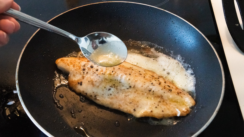 After three minutes, and when the fish starts coloring slightly underneath, flip both the fillets over, and add some butter to the pan, maybe about a tablespoon. Tilt the pan, and use the melted butter and juices to baste the fish. Fry for another two to three minutes until the fish is no longer translucent.