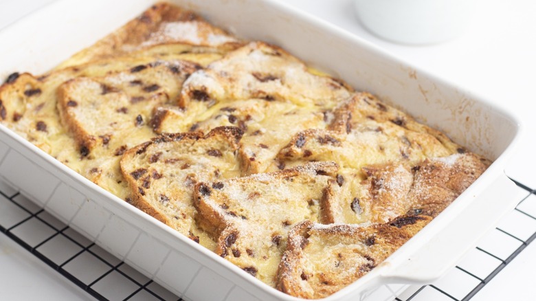 For this quick and easy recipe, we mean pudding in the British sense of the word — according to Vox, that's a generic term for the "sweet, final course of the meal." Despite bread and butter pudding's origins as an 11th century British peasants' dessert, its delicious flavor and wonderful texture have brought it back as a comfort food in the last century.