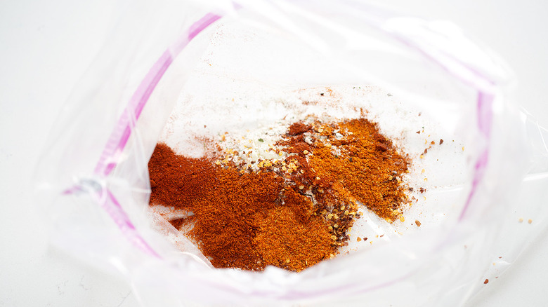 - In a large (2-gallon) zip-top bag, pour in the dry ranch dressing mix, red pepper flakes, smoked paprika, cayenne pepper, and Old Bay Seasoning.