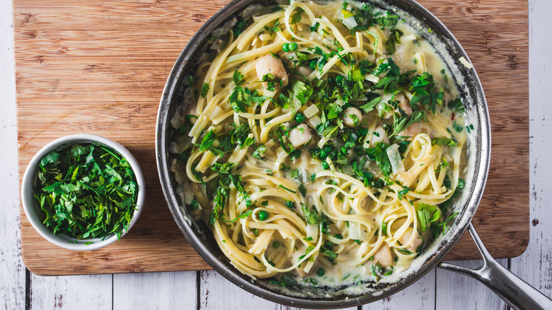 If you're looking to make something truly special and delicious, consider a creamy dish of fettuccine pasta, topped off with perfectly seared scallops, dotted with peas, and sprinkled with fresh parsley. Scallops are one of those perfect foods — they're quick to cook, easy to make, and so incredibly delicious. They'll wow you for days. Combine that with pasta and creamy Alfredo, and you've got yourself a meal worthy of the gods, according to food blogger and photographer Ksenia Prints of At the Immigrant's Table.