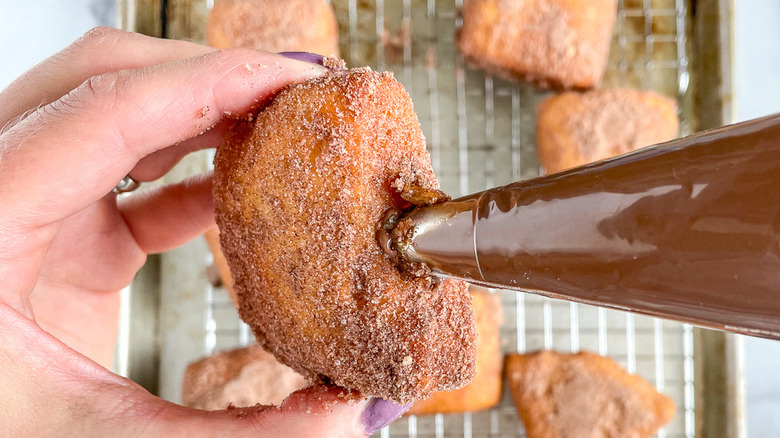 - While the doughnuts are still warm, grab a piping bag fitted with a #10 piping tip. Fill the piping bag with the Nutella and insert the tip into the doughnut via the holes you made with your chopstick. Gently pipe the Nutella into the channel.