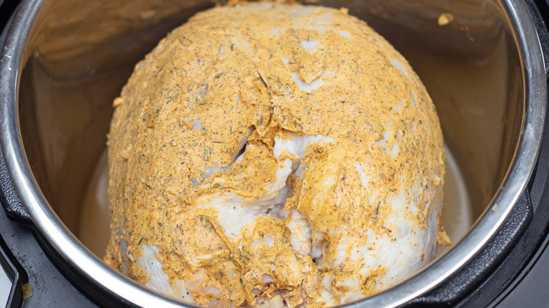 "If your turkey breast is large," says Latimer, "you may not be able to use the trivet." In this case, she says, you should place the turkey breast in the Instant Pot meat-side up. "Do not place the turkey breast meat-side down without the trivet," she warns, saying "the butter will make your Instant Pot give a burn notice." One workaround might be to skip the butter and then place the turkey breast meat-side down, but Latimer says she doesn't really recommend doing so. This would submerge the meat in the liquid, something she says would make it "likely to fall apart like soup meat."