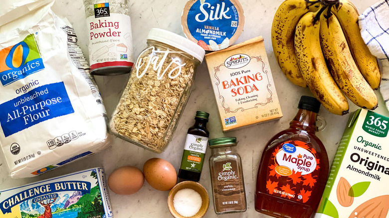 To bake this loaf of banana-oat goodness, you'll need to gather all-purpose flour, baking soda, baking powder, cinnamon, and salt. Also bring out some rolled oats, four over-ripe bananas, maple syrup, unsalted butter, milk, yogurt (any kind), eggs, and vanilla extract.