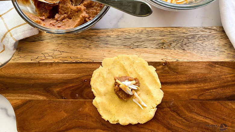 Flatten one masa ball into a disc. "The thickness should be around an eighth of an inch, but it doesn't have to be exact," says Hahn. Then scoop half a tablespoon or more of beans into the masa and add a pinch of shredded cheese. If you'd like to add extra ingredients, do so here.