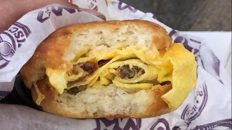While all those meats are a bit greasy, the biscuit holds them together surprisingly well. And if you need a little something extra, we recommend asking for a ketchup packet and spreading it on one of the biscuits. We know, we know — it's not for everyone. But that touch of sweetness can definitely make this breakfast sandwich even more appealing than it already is.