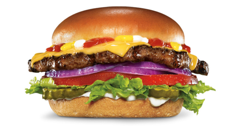 When you order this burger, you're going to get a charbroiled patty in between a seeded bun. Ketchup, mustard, and pickles are the only adornments you'll find on this sandwich. Without any other veggies or even a slice of cheese to make this burger more interesting, you may just fall asleep when you're eating it. The exception? Picky eaters might find this burger pretty inoffensive. Plus, the taste isn't too bad if you're not looking for anything special. However, with so many items on the menu that are actually fantastic, we don't know why you would choose this option in most cases.
