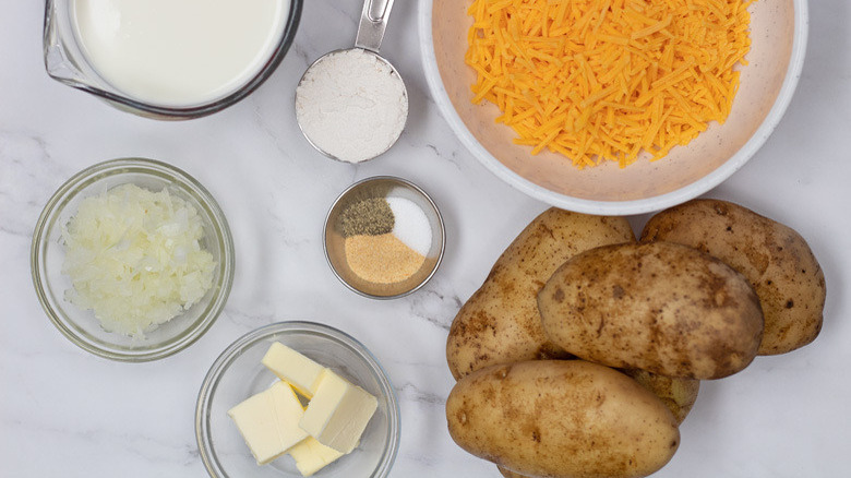 In addition to your potatoes, you will also need four tablespoons of butter, one small yellow onion, preferably grated (but diced will work well too), a quarter cup of all-purpose flour (don't worry about sifting for this recipe), two cups of milk (whole or 2% please), two teaspoons of garlic powder, half a teaspoon each of salt and freshly ground pepper, plus more to taste. And of course, you will need cheese. Two cups of grated cheddar cheese, to be specific, although Latimer points out that you can use a variety of different cheeses instead. "Colby Jack is great for melting and less greasy. A combo of cheddar and Monterey Jack is also great. Sharp cheddar is quite tasty. And Gruyère cheese is a real treat!" according to Latimer.