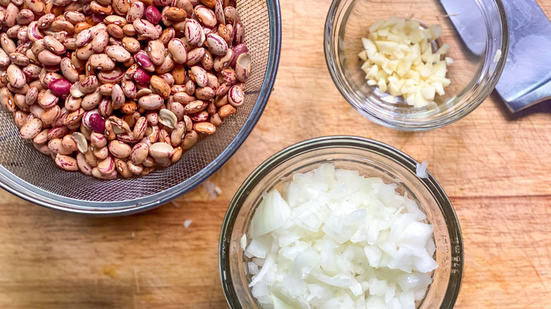 To start off, you'll sauté onions and garlic to create a flavorful base for the beans. Hahn isn't fussy about the type of oil — stick to what you regularly use for sautéing vegetables. Next, pinto beans are the star ingredient for this recipe. You'll need 16 ounces, or about two cups.