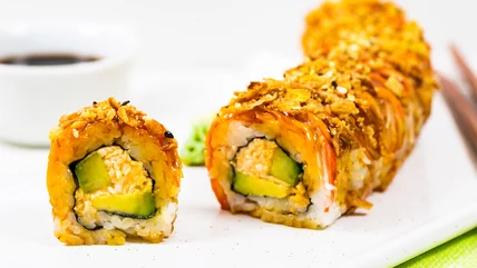 But if uncooked fish makes you squeamish, there are rolls where the seafood is cooked. The crunch roll is perfect for those who are apprehensive about eating raw fish because it includes shrimp, which is cooked. To give the roll a nice crunch, it has tempura shrimp. The shrimp is covered in a batter with Panko, a brand of bread crumbs, and then deep-fried for a delicious flavor, warmth, and crunchy texture. Like other rolls, it has rice and nori, also known as seaweed, crab meat, and avocado. Some restaurants may use cucumber, too. To finish off the roll, tempura flakes are sprinkled on top of it for a nice presentation and an additional crunch, according to sushi world. Yum!