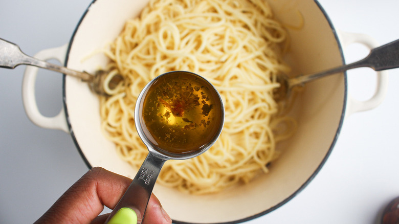 Once the spaghetti comes to your preferred state of doneness — generally, al dente — drain off the excess water and place the noodles back into the stock pot. Then drizzle two tablespoons of the sun-dried tomato oil over the pasta and mix them with hands or utensils so the pasta doesn't stick together. The worst thing would be to end up with large clumps of noodles because they were left un-oiled at this point.
