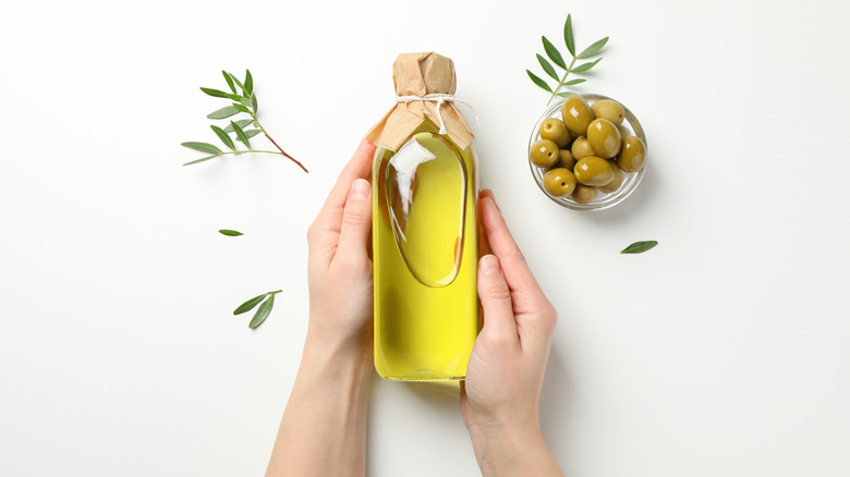 Unlike vegetable oil, however, which has a cleaner flavor, olive oil has a distinct flavor of its own (via Spoon University). When you are adding it to a dish, be prepared for a subtle buttery, peppery, and olive-like flavor in your food. This addition of flavor makes olive oil an ideal choice for salad dressings and sautéing, as well as using it as a side for dipping or drizzling it onto a dish to finish it off with an extra depth of flavor. When baking, however, it's best to stick to a neutral oil, like vegetable oil, so that the oil does not change the flavor of your bakes. That's if you aren't baking an olive oil cake, of course.