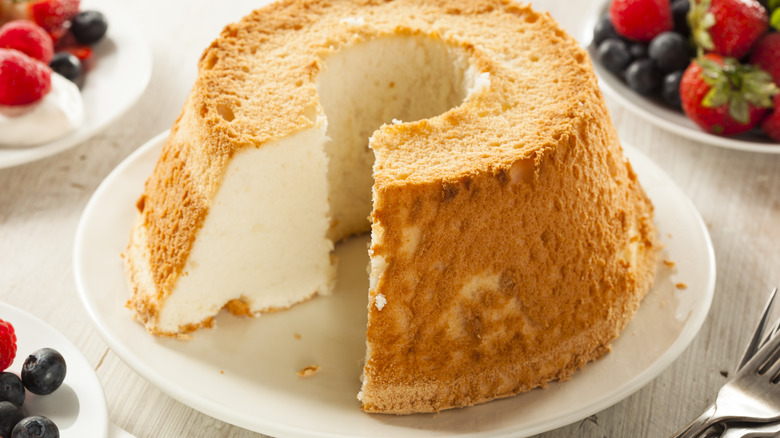 It's also important to use actual cake flour rather than regular flour or whole wheat flour in your recipe, Tip Hero suggests. The reason? Cake flour has a lower protein content, making the batter less tender. And last but not least, as tempting as it sounds (and no matter how much you're used to greasing the pan with butter or cooking spray), resist the temptation. If the angel food mold becomes too greasy, it won't rise properly. To make sure the cake is able to slide out of the mold with ease, cool it upside-down.