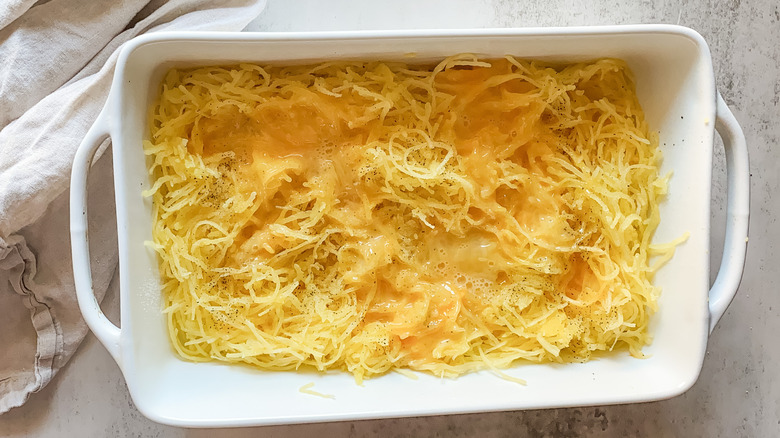 - Place all spaghetti squash noodles into a lightly greased 9x13-inch baking dish.