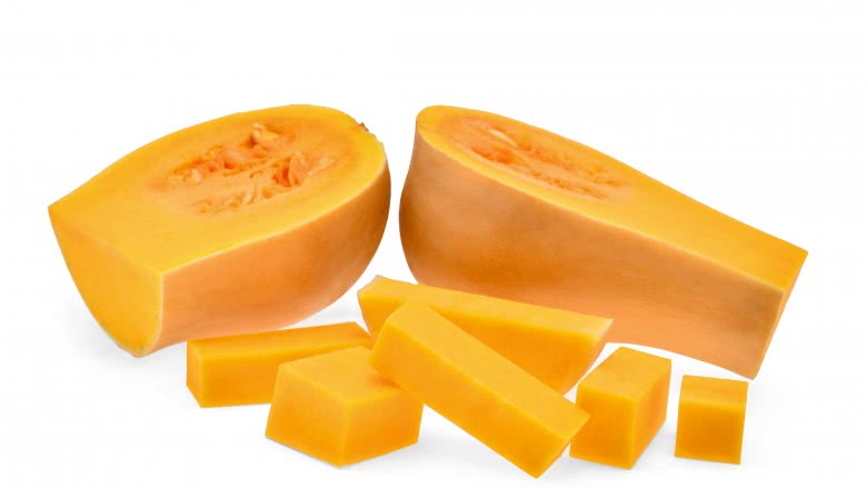 Now, trim off the top and the bottom. Next, make a cut between the round, bulbous part of the squash and the neck. The round bottom is a bit more work because it holds the seeds, so let's get that part over with. Cut it in half to expose the seeds, then take a spoon and scrape them out — along with all the stringy bits. Take what's left and cut it into 1/2-inch to 1-inch pieces (depending on how big you want them for cooking). Take your long pieces, turn them so they're facing you horizontally, and slice them into 1/2-inch to 1-inch squares. Repeat the same process with the neck half of the squash. This side will be so much easier without that gaping hole in the middle of your work surface. Bonus: now that you know how to cut a squash, you can apply this technique to many other similarly shaped foods — from a pumpkin to a pineapple. Just remember, flat surfaces!