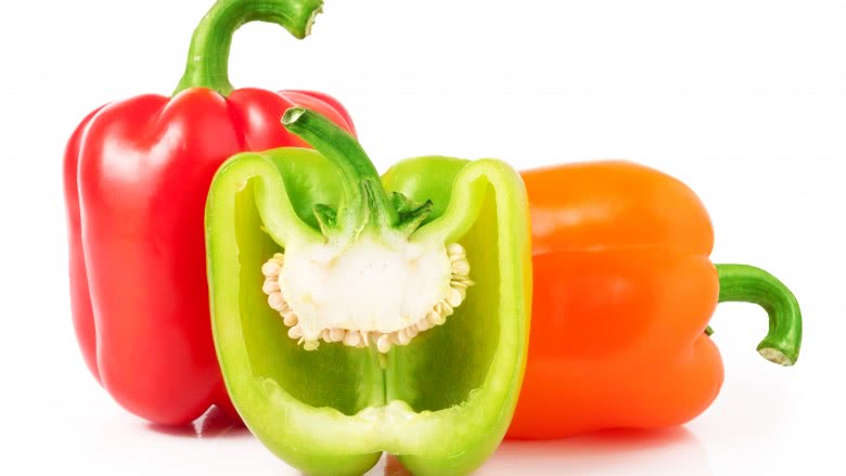 Peppers are one of my favorite veggies to work with. Partly because I love their bright colors, but mostly because they're one of the least demanding cuts. Start by chopping off the very top of the pepper (with the stem) and the very bottom of the pepper. Now, slice into one side of the pepper vertically, and carefully unroll the skin until it lays flat on your chopping board — as if you're opening its coat. Carve the white parts out of the inside of the pepper skin. From here, it's smooth sailing. You have a flat, easy-to-work-with canvas that allows you to either chop into long thin strips (julienne) or dice into small, medium, or large squares.