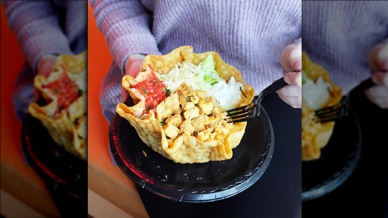 Who said that salads had to be boring? You're definitely not going to get bored of your meal when you order a classic tostada salad. Of course, it all starts with a bed of fresh greens that will make you feel super healthy. But it gets even better from there. That's because the whole dish is served in a tostada bowl. And yes, you're totally encouraged to break off pieces of bowl as you go. Then comes the rice, beans, lettuce, pico de gallo, chicken, sour cream, and more. Mix these ingredients up in the tostada bowl, or just pick through them one at a time. No matter how you decide to tackle this salad, it's going to be a hit.