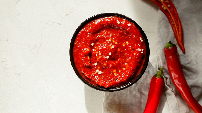 If you're looking for a punch of heat, a bit of sweetness, and a little acidity, you may want to consider creating a mixture of tomato paste with red pepper flakes. To avoid a mixture that's way too spicy, be conservative with the spicy specks, adding about a half tablespoon of red pepper flakes to three or four tablespoons of tomato paste for your concoction.