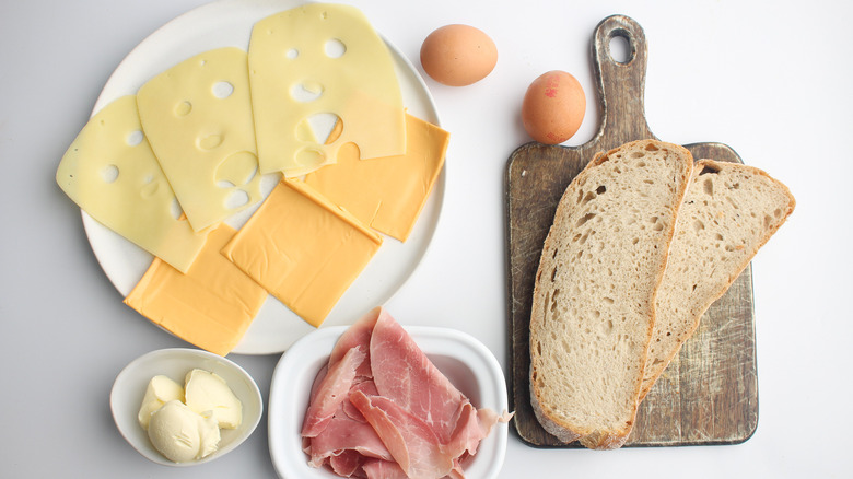 To get as close to the taste of the Moons Over My Hammy sandwich that Denny's makes, you'll need 2 slices of sourdough bread. This is a breakfast sandwich, so you're also going to need eggs, meat, and cheese. For meat, this recipe calls for 4 slices of ham. You'll also need Swiss cheese and American cheese if you really want that Denny's taste. And to properly toast the sandwich in the skillet, you'll also need some butter.