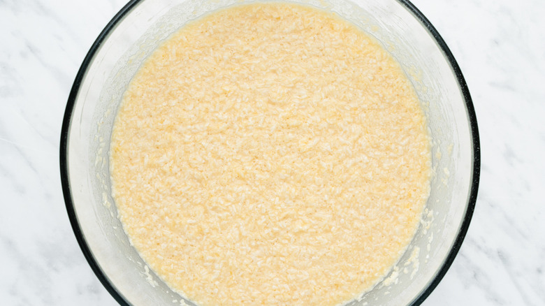 The first thing to do is to gather your ingredients. If you bake a lot, you are in luck, because you may already have a lot of the items needed, as you use many of these ingredients when baking. For starters, you'll need a cup of sugar and melted butter. In addition, you'll want to have handy four large eggs and all-purpose flour. At this time, you will also want to add shredded coconut to your list, which will provide the perfect amount of coconut flavor. To complete your necessary ingredients, pull out milk, vanilla extract, and baking powder. Now, it's time to get to work!