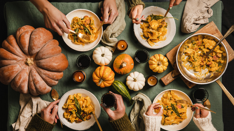 As everyone is well aware by now, the season for all things pumpkin-flavored has most definitely arrived. While Trader Joe's always rolls out a slew of fall-flavored products each year in addition to some new items, there's one product that just hit shelves that people cannot wait to give it a try. It's the new pumpkin Alfredo sauce. Just imagine it with some of Trader Joe's ravioli or pumpkin-shaped zuccette pasta (via Become Betty).