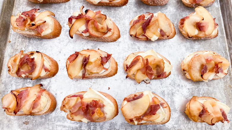 Lay out the sliced bread on the prepared baking sheet, evenly placing each slice in spaced rows. Next, put the Brie slices onto the bread and then top those off with apples and prosciutto. And just like that, you're ready to bake. "You can assemble these ahead of time and refrigerate until you are ready to bake," Johnson notes. Pop the baking sheet into the heated oven bake the crostini until the cheese is bubbly, which will take approximately 10 minutes.