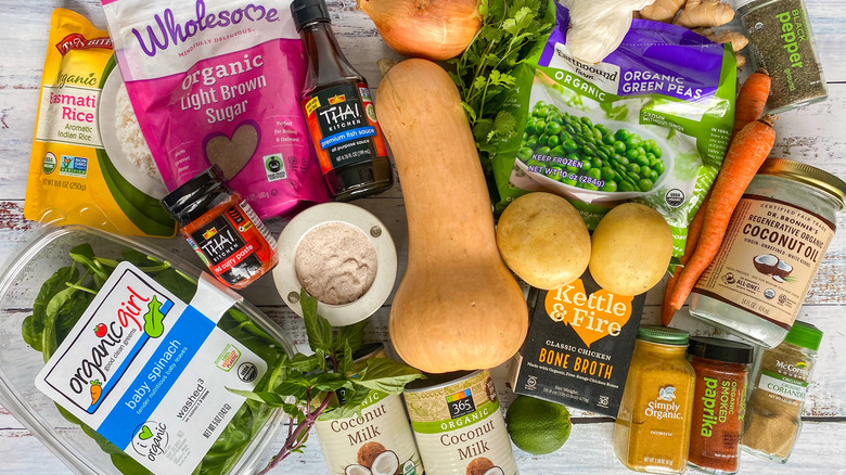 In addition to the butternut squash, you'll be using carrots, a yellow onion, fresh garlic and ginger, a Yukon gold potato, a lime, fresh spinach, and frozen peas. For cooking, you'll need coconut oil, coconut milk, and either chicken or vegetable broth. For spices and seasonings, you're going to gather up red curry paste, powdered coriander, turmeric powder, smoked paprika, brown sugar, and some savory, umami-rich fish sauce.