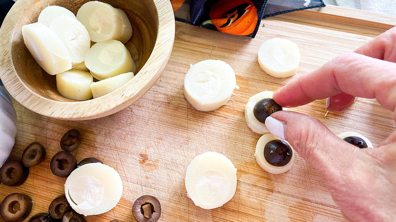 Whole hearts of palm come in little cylinder shapes, and you'll need to slice each cylinder into ¼-inch rounds. Next, open the can of olives, and put a sliced olive in the center of each hearts of palm slice. This will make an "eyeball." Hahn suggests, "Look for the ends of the olives in the can [since] those pieces will be solid without a center hole." Set aside your olive eyeballs for the time being, or pop them into the fridge while the pasta cooks.