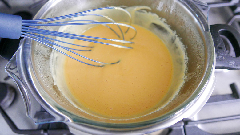 Let's start out by putting a heatproof bowl over a pan of simmering water to create a double boiler. Make sure the water is not touching the bottom of the bowl. Whisk together the egg yolks and ¾ cup of the sugar in the heated bowl, until the sugar is dissolved and the mixture has a light yellow color. Your ideal consistency here is smooth and silky. Also, since you're just using egg yolks and not the whites, you're ensuring that the filling will be incredibly rich — perfect for tiramisu!