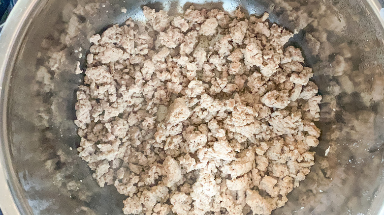 - Turn the Instant Pot to the sauté setting. As it heats up, add the olive oil. Once the oil is hot, add the ground turkey. Break it up with a wooden spoon and cook until no longer pink, about 10 minutes.